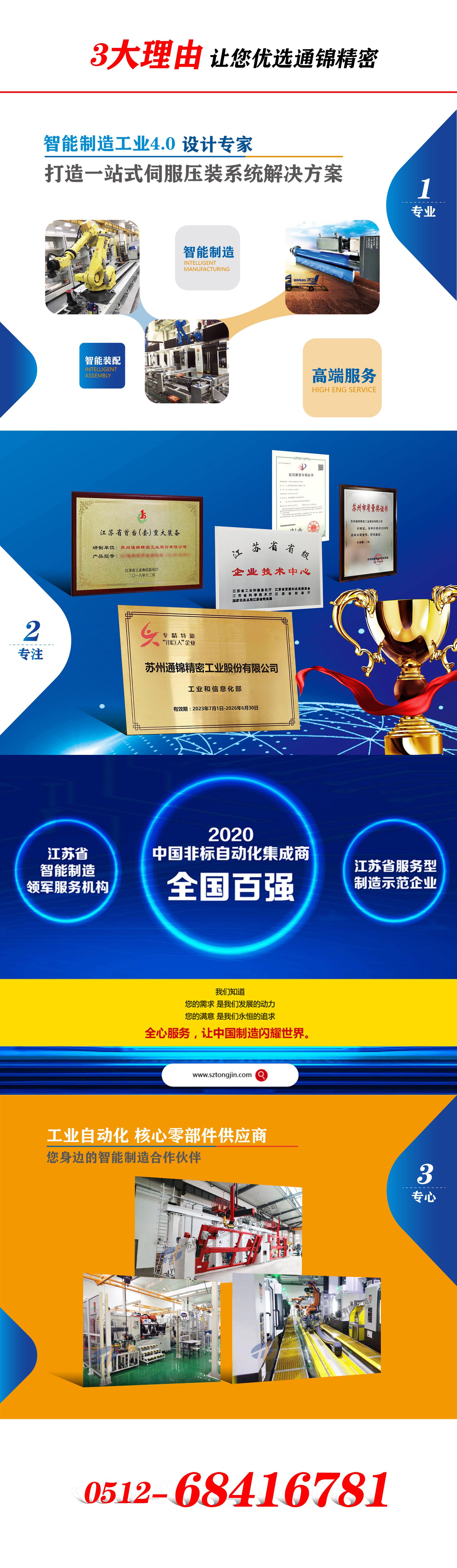 多年來(lái)公司一直以“工廠實(shí)現(xiàn)綠色無(wú)人化”為愿景;以“通向世界、錦繡中華”為使命;以“創(chuàng)新、進(jìn)取、誠(chéng)信、和諧”為企業(yè)核心價(jià)值觀。公司在引進(jìn)國(guó)外高尖端自動(dòng)化核心元件的基礎(chǔ)上,大力投入研發(fā)資金,主要針對(duì)新能源汽車,光伏、5G、儲(chǔ)能電池等行業(yè)智能伺服裝配技術(shù)需求,已成功自主研發(fā)、設(shè)計(jì)、組裝、銷售通錦牌伺服電動(dòng)缸、智能伺服壓裝機(jī)、第七軸機(jī)器人、(重型)桁架機(jī)器人等自主產(chǎn)品,結(jié)合六關(guān)節(jié)機(jī)器人實(shí)現(xiàn)自動(dòng)化、安全化、無(wú)人化的智能裝配綠色無(wú)人化生產(chǎn)線,提供一站式工廠智能裝配自動(dòng)化系統(tǒng)整體解決方案,實(shí)現(xiàn)工業(yè)4.0。同時(shí)為客戶提供高端貿(mào)易品牌工控核心零部件:意大利Gambini齒輪齒條、Panasonic伺服系統(tǒng)、Rexroth變頻器、Nidec減速機(jī)、APEX減速機(jī)。