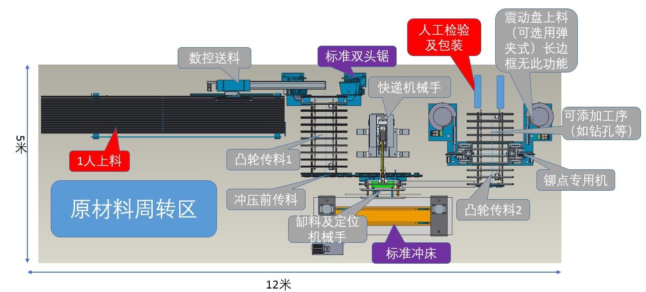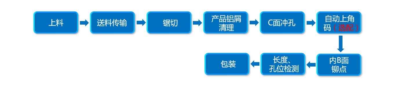 本光伏邊框生產(chǎn)線將機器人的智能化引入、融進該項加工工藝,為用戶生產(chǎn)需求量身定制。由送料傳輸、鋸切、C面沖孔、自動上角碼、內(nèi)B面鉚點、長度、孔位檢測、包裝等工序組成。該光伏邊框生產(chǎn)線可以由傳統(tǒng)沖壓線及標(biāo)準(zhǔn)鋸切機及常用模具配合自動上料鋸切,下料機器人沖壓及自動上角碼,鉚點及下料等工序組成,結(jié)合了手工線的優(yōu)勢,并采用機器人及智能傳料。并采用總線控制運動控制系統(tǒng),滿足制造工藝的自動化控制要求,實現(xiàn)高效率、高精度,實現(xiàn)全自動化。為光伏邊框生產(chǎn)廠家所面臨的自動化程度低、產(chǎn)品質(zhì)量不穩(wěn)定、作業(yè)人員工作強度大等問題提供了智能自動化解決方案。